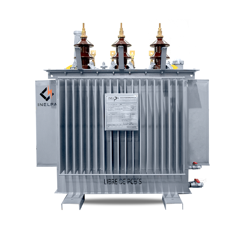 Transformador Trifásico de Distribución Llenado Integral. Trifilar con conexión DyN11. Triángulo estrella, con neutro accesible. Conmutador de cinco puntos, accionable desde el exterior estando el transformador sin tensión. De cuba prismática, con paneles aletados para la disipación de temperatura, refrigeración ONAN. Fabricados bajo Norma IRAM 2250, IRAM 2269 incluye normalizados.