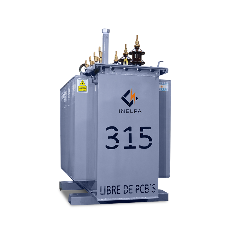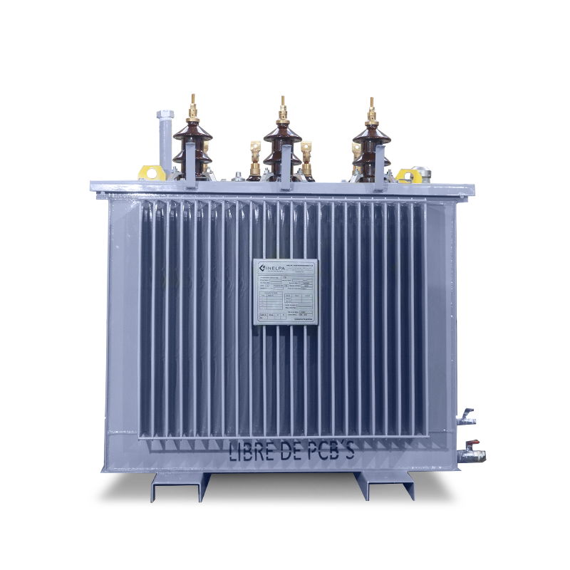 Transformador Trifásico de Distribución Llenado Integral. Trifilar con conexión DyN11. Triángulo estrella, con neutro accesible. Conmutador de cinco puntos, accionable desde el exterior estando el transformador sin tensión. De cuba prismática, con paneles aletados para la disipación de temperatura, refrigeración ONAN. Fabricados bajo Norma IRAM 2250, IRAM 2269 incluye normalizados.