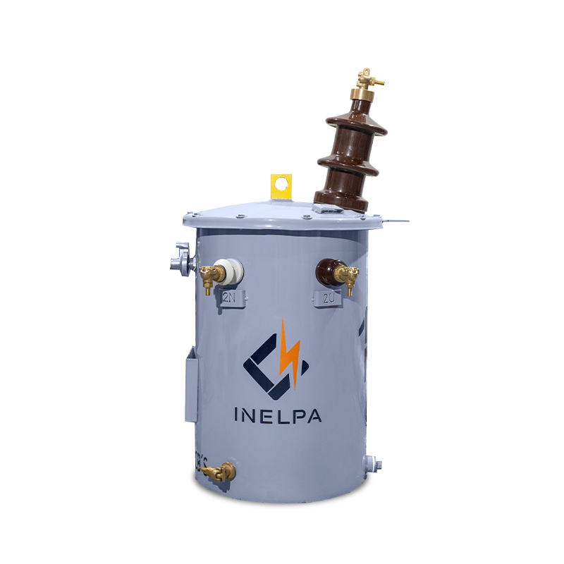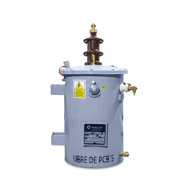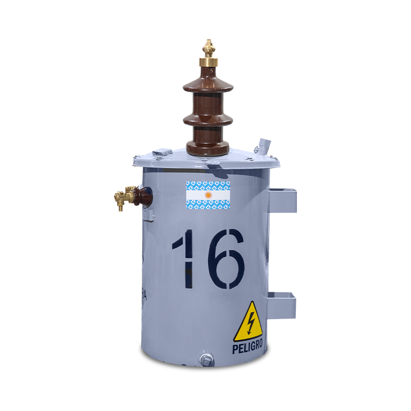 Transformador Monofásico Rural. Unifilar con conexión directa. Conmutador de tres puntos (con opción de cinco puntos), de fácil acceso, accionable desde el exterior estando el transformador sin tensión. De cuba cilíndrica, monoposte, con cáncamo de izaje en tapa, refrigeración ONAN. Fabricados bajo Norma IRAM 2269, incluye accesorios normalizados.
