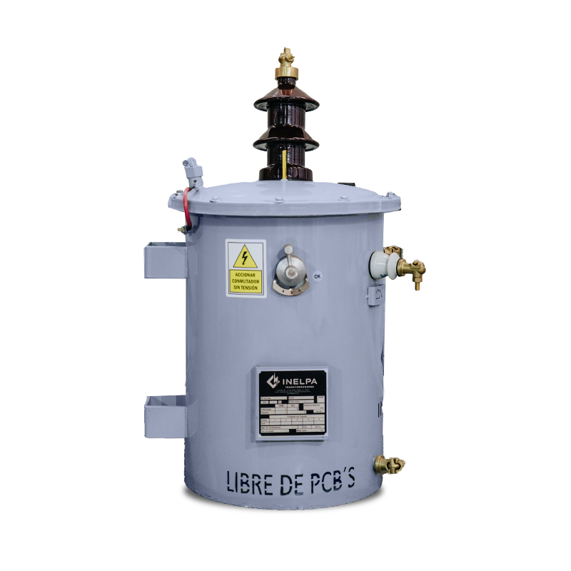 Transformador Monofásico Rural. Unifilar con conexión directa. Conmutador de tres puntos (con opción de cinco puntos), de fácil acceso, accionable desde el exterior estando el transformador sin tensión. De cuba cilíndrica, monoposte, con cáncamo de izaje en tapa, refrigeración ONAN. Fabricados bajo Norma IRAM 2269, incluye accesorios normalizados.