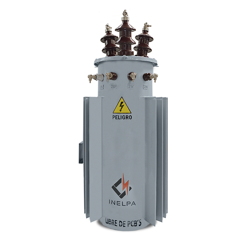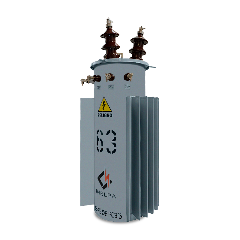 Transformador Trifásico Rural. Trifilar con conexión DyN11. Triángulo estrella, con neutro accesible. Conmutador de tres puntos (con opción de cinco puntos), de fácil acceso, accionable desde el exterior estando el transformador sin tensión. De cuba cilíndrica, monoposte, con cáncamo de izaje en tapa, refrigeración ONAN. Fabricados bajo Norma IRAM 2269, incluye accesorios normalizados.
