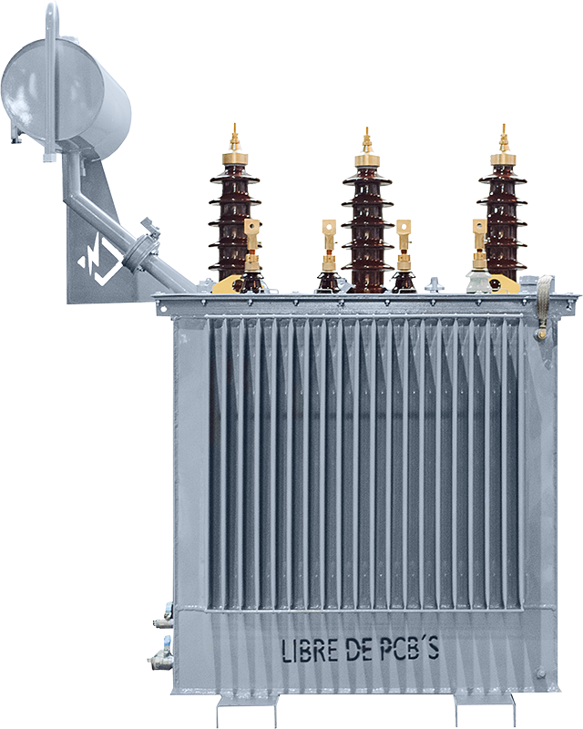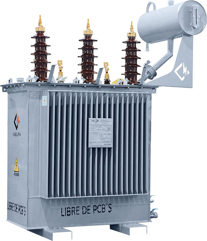 Transformador Trifásico de Distribución con Tanque de Expansión. Trifilar con conexión DyN11. Triángulo estrella, con neutro accesible. Conmutador de cinco puntos, accionable desde el exterior estando el transformador sin tensión. De cuba prismática, con paneles aletados para la disipación de temperatura, refrigeración ONAN. Fabricados bajo Norma IRAM 2250, IRAM 2269 incluye normalizados.