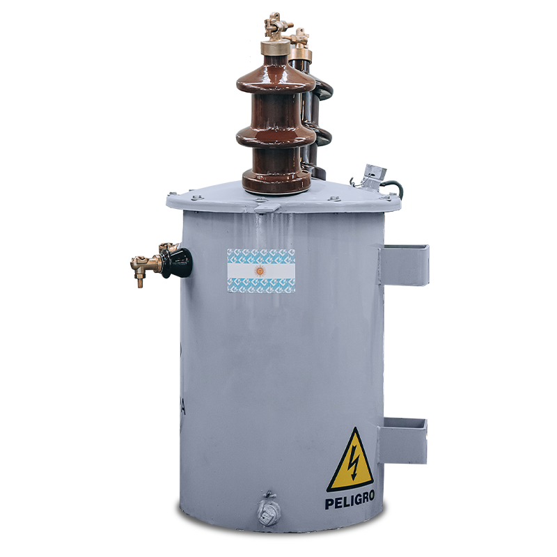 Transformador Bifásico Rural. Bifilar con conexión directa. Conmutador de tres puntos (con opción de cinco puntos), de fácil acceso, accionable desde el exterior estando el transformador sin tensión. De cuba cilíndrica, monoposte, con cáncamo de izaje en tapa, refrigeración ONAN. Fabricados bajo Norma IRAM 2269, incluye accesorios normalizados.