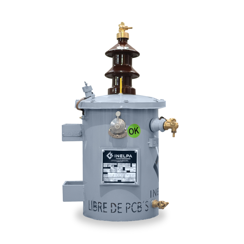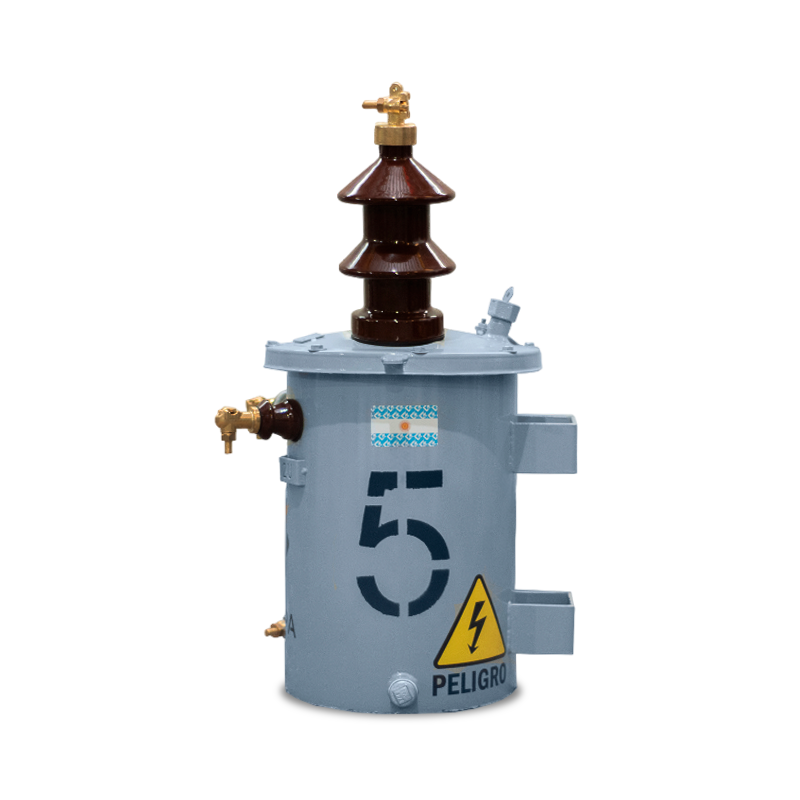 Transformador Monofásico Rural. Unifilar con conexión directa. Conmutador de tres puntos (con opción de cinco puntos), de fácil acceso, accionable desde el exterior estando el transformador sin tensión. De cuba cilíndrica, monoposte, con cáncamo de izaje en tapa, refrigeración ONAN. Fabricados bajo Norma IRAM 2269, incluye accesorios normalizados.