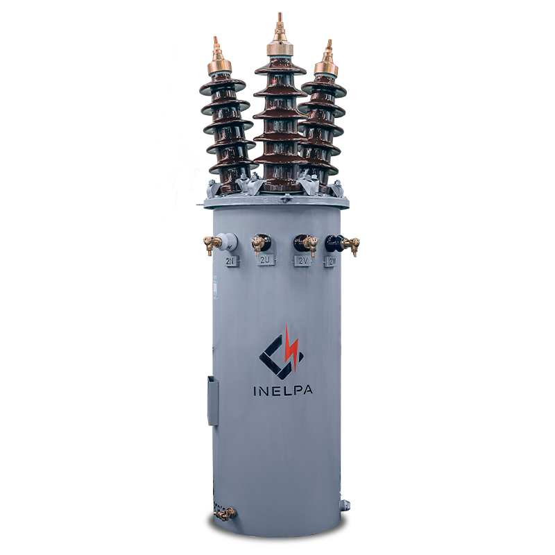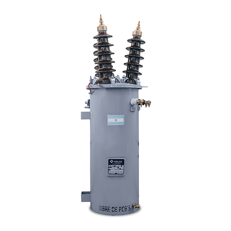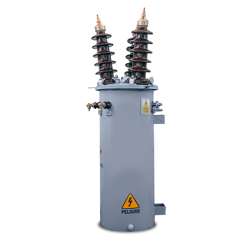Transformador Trifásico Rural. Trifilar con conexión DyN11. Triángulo estrella, con neutro accesible. Conmutador de tres puntos (con opción de cinco puntos), de fácil acceso, accionable desde el exterior estando el transformador sin tensión. De cuba cilíndrica, monoposte, con cáncamo de izaje en tapa, refrigeración ONAN. Fabricados bajo Norma IRAM 2269, incluye accesorios normalizados.